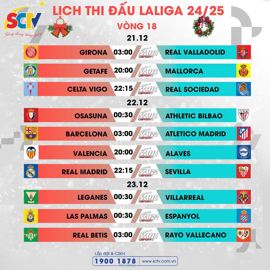 ✅ Đón xem ngay vòng 18 LALIGA EA SPORTS từ ngày 21/12 – 23/12 trên app SCTVOnline và hệ thống kênh SCTV.